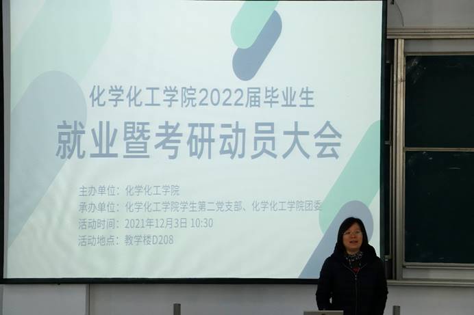 学院院长徐衡作就业暨考研动员讲话。她鼓励毕业生们:一是要坚定信心。不要害怕问题和困难,相信自己,摆正心态,顶住压力。二是要脚踏实地。在面临考研、就业、考编、考公等选择时,要有长远的眼光看待问题,结合自身实际,踏踏实实努力,才能换来更美好的未来。三是要坚持不懈。作为新时代大学生,要勇担时代使命,志存高远,不畏艰难险阻,将个人理想追求融入党和国家事业中,为党、为祖国、为人民多作贡献。