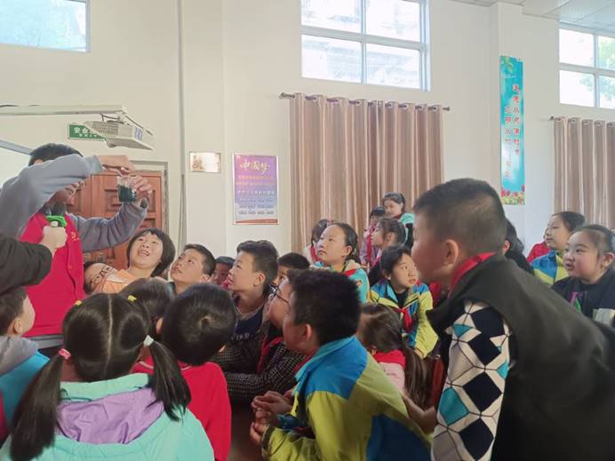 活动开始,2020级化学2班许乐怡作为主讲人,直接切入正题,询问同学们之前是否接触过化学实验,学生们踊跃回答,气氛热烈。而后,主讲人许乐怡为同学们播放化学实验视频,志愿者们对实验进行了介绍及演示。可乐放薄荷糖实验、气球膨胀实验、土豆遇碘变色实验、高锰酸钾红绿灯实验......众多兼具知识性与趣味性的化学实验在课堂上轮番“上演”。这些化学实验令现场的学生十分兴奋,纷纷积极举手提问:“可乐与薄荷糖为什么不可以混合食用?”“土豆和碘发生了什么反应呀?”......面对这些问题,2021级化学4班的志愿者史世伟为学生们讲述了实验的原理,耐心为学生们解惑。